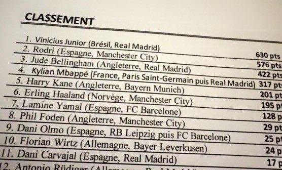 另外一版金球奖网传排名则不同,罗德里596分第一,维尼修斯580分第二,贝林厄姆450分第三。